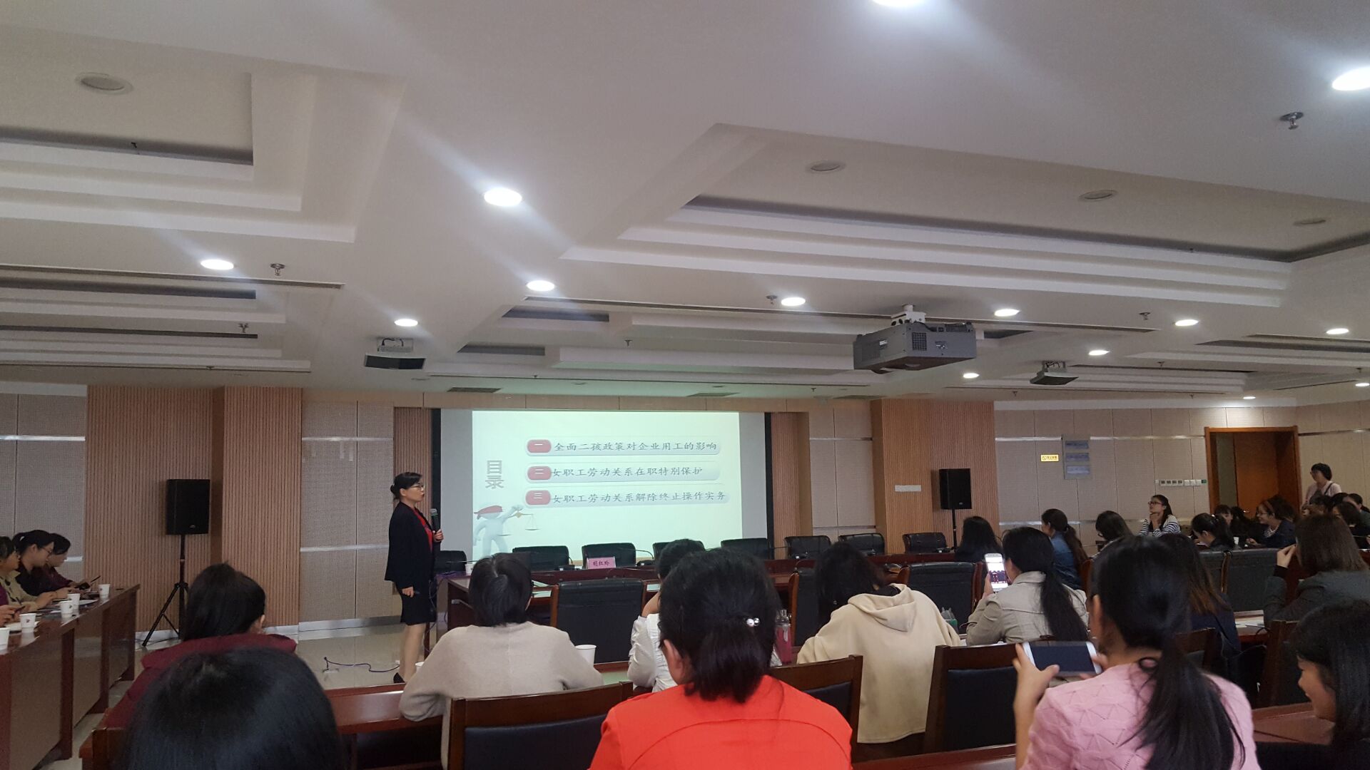 此次培訓邀請了安徽力瀾律師事務(wù)所律師、安徽省勞動(dòng)法學(xué)會(huì )理事胡紅玲律師向廣大工會(huì )委員進(jìn)行關(guān)于《安徽省女職工勞動(dòng)保護特別規定》等法律法規知識內容。并結合實(shí)際案例,就全面二孩政策對企業(yè)用工的影響、女職工落實(shí)“五期”勞動(dòng)保護和生育待遇等相關(guān)內容進(jìn)行了詳細分析和講解,內容生動(dòng)又實(shí)用,為全區女干部職工上了一堂精彩的法律法規知識培訓課。