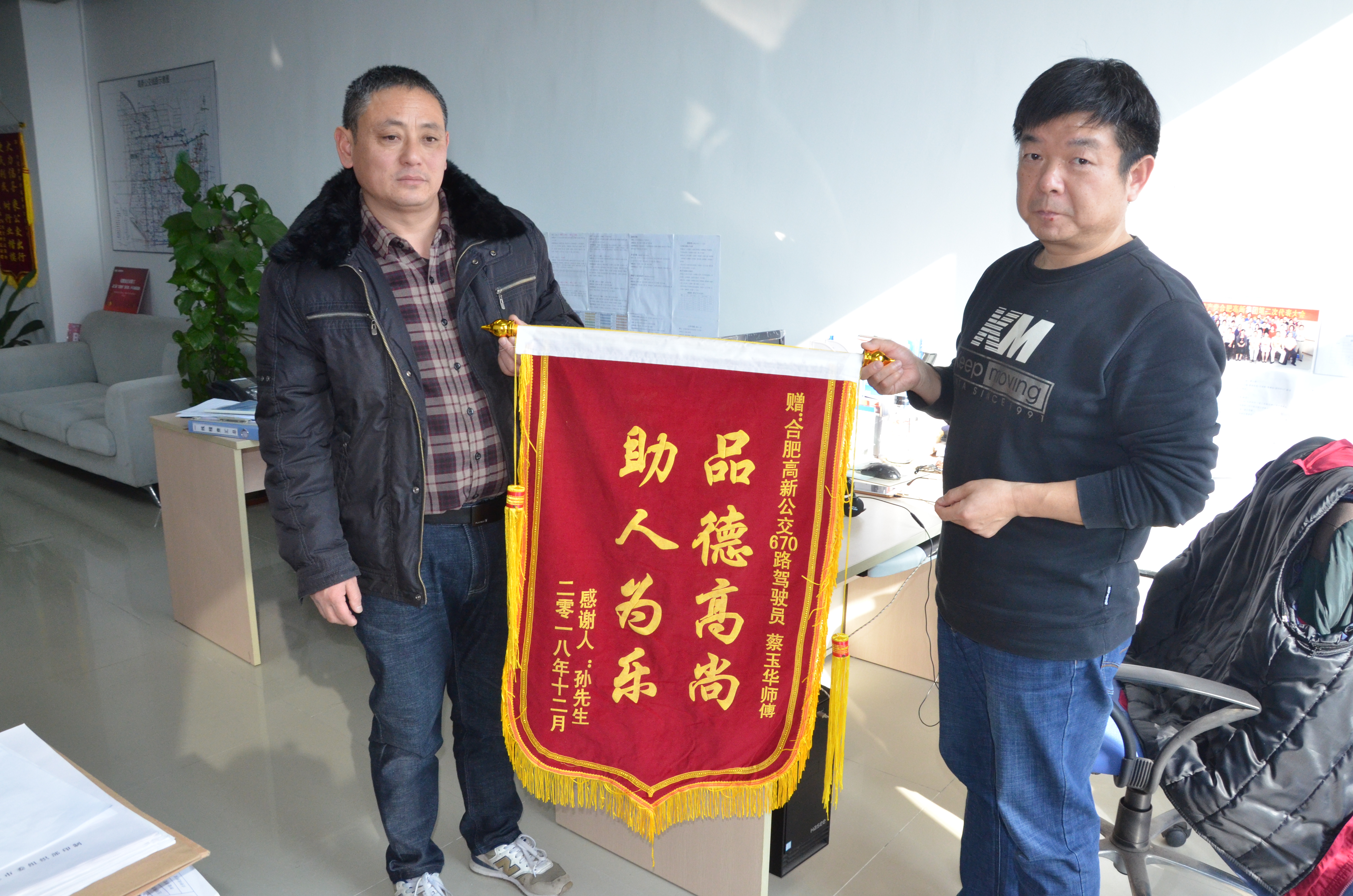 12月17日下午,市民孫先生來(lái)到高新公交,送來(lái)一面寫(xiě)有“品德高尚 助人為樂(lè )”的感謝錦旗。原來(lái)在12月14日晚上,670路公交車(chē)司機蔡玉華幫其走失的母親順利回家。