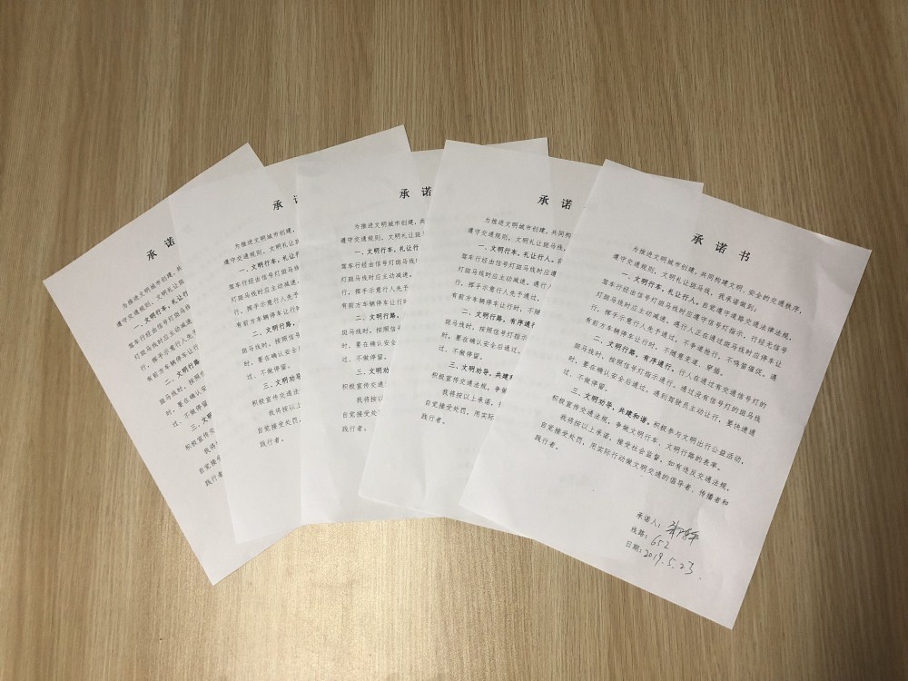 禮讓行人,傳播文明;創(chuàng )建文明,我來(lái)承諾。駕駛員自愿簽訂《禮讓斑馬線(xiàn)承諾書(shū)》,自覺(jué)做到斑馬線(xiàn)前主動(dòng)禮讓?zhuān)浞终故靖咝鹿粏T工的職業(yè)素質(zhì)和文明形象,大家從我做起、從小事做起,共同營(yíng)造更加暢通、有序、文明的城市道路交通環(huán)境。