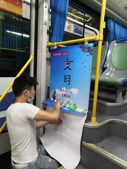 為做好文明創(chuàng )建工作,高新公交不斷增加公交公益廣告宣傳力度,對車(chē)廂內部公益廣告進(jìn)行統一制作和安裝。