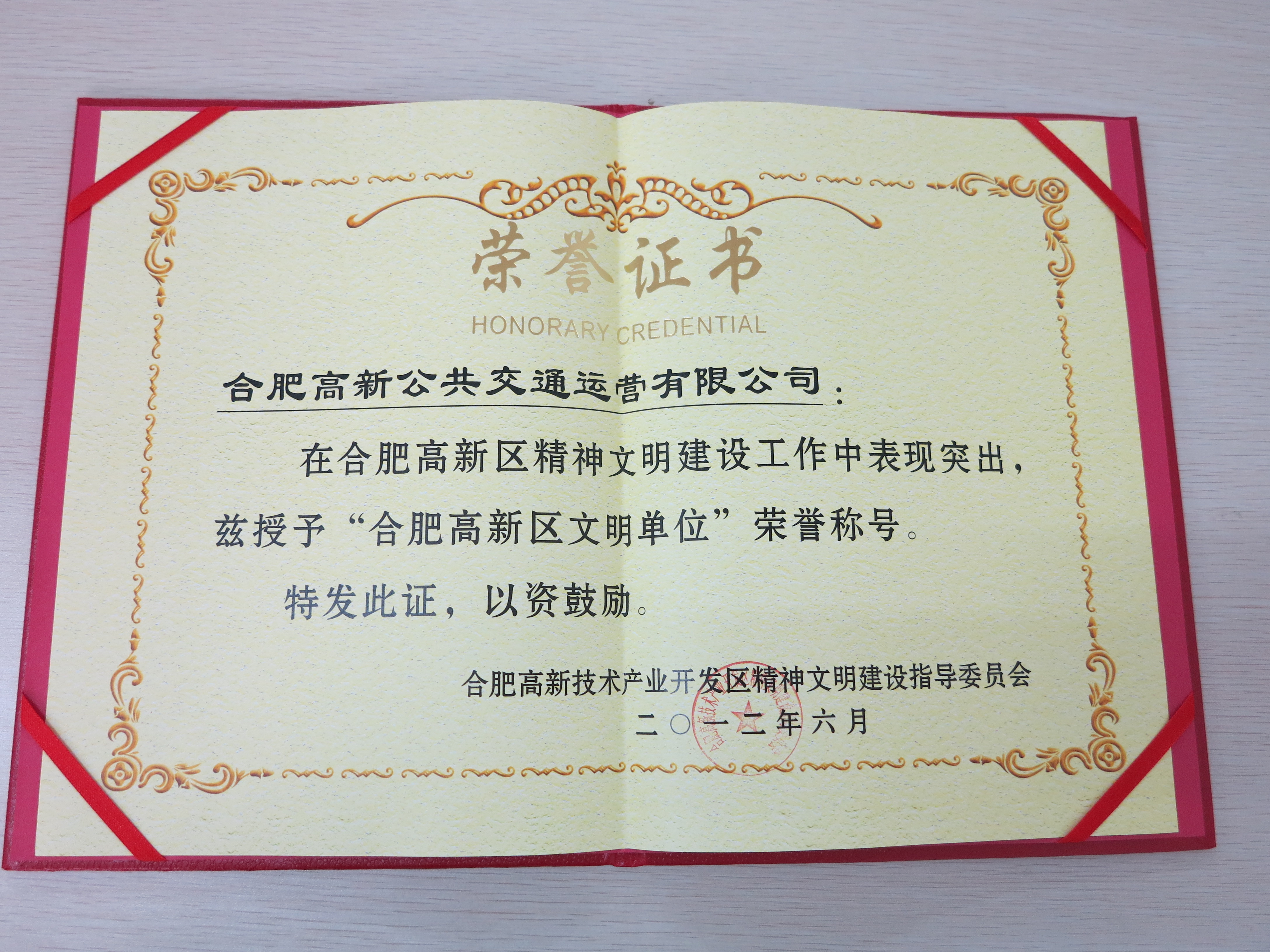 6月11號下午,高新區創(chuàng )建全國文明城市總結表彰動(dòng)員大會(huì )在高新區管委會(huì )隆重舉行,合肥高新公交榮獲“高新區文明單位”榮譽(yù)稱(chēng)號,高新公交負責人孔強同志代表公司領(lǐng)取了榮譽(yù)證書(shū)。