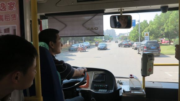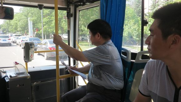 運營(yíng)管理部負責人(左一)跟車(chē)參加應聘駕駛員的路考考試。