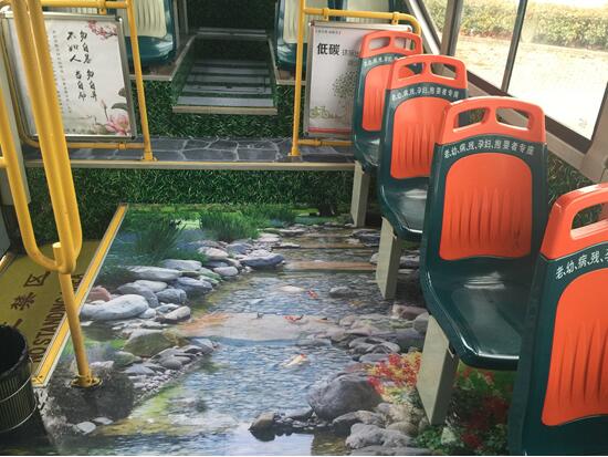 以“環(huán)保出行·綠樹(shù)成蔭”為主題的公交車(chē)車(chē)廂外是綠色叢林,還有小鹿藏身其中;一進(jìn)入車(chē)廂,入眼的全是綠色,感覺(jué)像是置身于叢林之中,乘客踏入車(chē)廂便像是穿行在森林間。