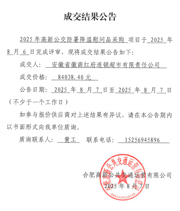 2025年高新公交防暑降溫慰問(wèn)品采購成交結果公告