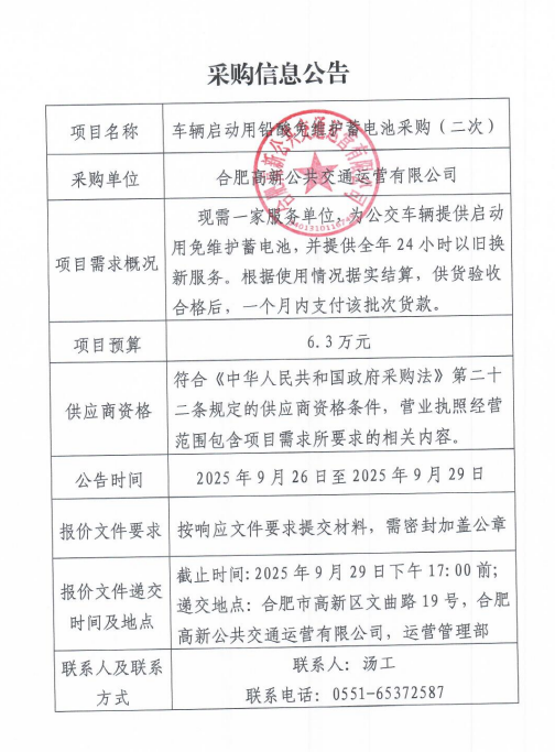 高新公交車(chē)輛啟動(dòng)用鉛酸免維護蓄電池采購信息公告