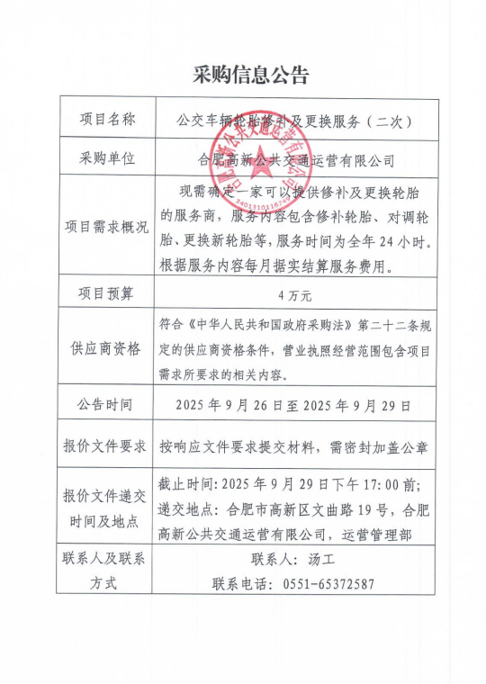 高新公交輪胎修補及更換服務(wù)采購信息公告